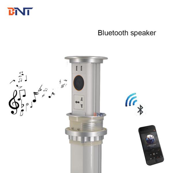 BW1501 is designed as an motorized pop up desktop socket with bluetooth speaker and wireless phone charger for kitchen.